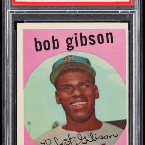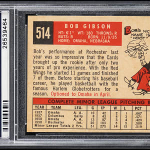 Graded NM-MT 8 by PSA with an (oc) qualifier. Phenomenal 1959 Topps #514 Bob Gibson rookie high number. St. Louis Cardinals Hall of Fame pitcher.