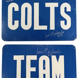 Recall the familiar feel and inviting appeal of venerable Memorial Stadium, with the acquisition of this double-sided Baltimore Colts tin sign. Sized at 36” x 24”, this ancient relic is a no-nonsense presentation, with the word “Colts” on one side, and “Team” on the opposite side. The color scheme is Colts blue and white, with white block lettering against a blue background. Moderate wear provides a great period authentic look, and the lettering shows strong integrity on both sides. Pre-drilled holes are located near the rounded corners at one end only, suggesting this metal sign hung in a fashion protruding into a concourse passageway. A pair of Colts alumni have signed on both sides of the sign, with Gino Marchetti and Lou Michaels. The (4) total silver felt-tip marker signatures average (“8” to “9”) potency. Marchetti has accompanied both of his signatures with the inscriptions “89, HOF 72”, and Michaels has followed suit with “#79” on both sides.