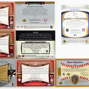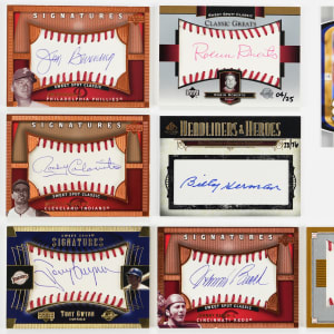 The "marks of greatness" are confirmed with these eight 2002-2008 Upper Deck Hall of Fame and star certified autographs. These "on card" signatures come from various tiered subsets. Includes: 2002 Sweet Spot Classics: Trammell; 2003 Sweet Spot: Gwynn; 2003 Sweet Spot Classic: Roberts (#/25); 2004 SP Authentic: Brett (#/50); 2005 Sweet Spot Classic: (3 cards) with Bench, Bunning, Colavito and 2008 SP Legendary Cuts: Herman cut (#/76).