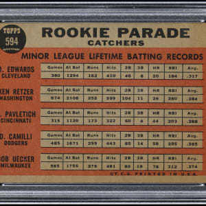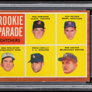 Graded EX 5 by PSA. A Hall of Fame sportscaster who was far better as a broadcaster than a ball player is found on the offered 1962 Topps #594 Rookie Parade high number. This "floating head" portrait of Milwaukee Braves catcher Bob Uecker is quite attractive and an ideal option for set collectors.