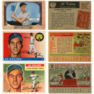 Triple play of 1955-1956 Topps and Bowman gum cards picturing Detroit Tigers Hall of Famer Al Kaline. Includes: 1.) 1955 Bowman #23 (VG); 2.) 1955 Topps #4 (VG-EX) and 3.) 1956 Topps #20 (EX).