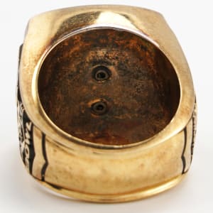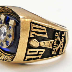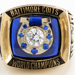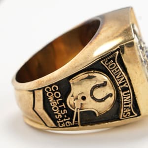 The Baltimore Colts Super Bowl V win is celebrated in grand fashion, with this 1970 salesman's sample 10K gold ring. Engraved with a Jostens hallmark and 10K symbol inside the band, this hefty piece of championship jewelry weighs in at a whopping 36.8 grams. The face is adorned with a CZ stone set in a high relief Colts horseshoe logo, studded with blue chips. These adornments are set against a blue background, with gold lettering that reads "Baltimore Colts" above and "World Champions" below. The left shank bears the name of franchise legend Johnny Unitas above a Colts helmet with horseshoe logo. Seen beneath the helmet is the result of the big game, with "Colts - 16, Cowboys - 13." The right shank is dated "1970," with two numbers of the date on either side of the iconic Lombardi Trophy. Residing below the trophy is the Super Bowl V logo, and all design elements on both shanks are fashioned in relief. Though the Colts won the NFL Championship in 1958, 1959 and 1968, this was their first and only Super Bowl win while calling the City of Baltimore home. A magnificent treasure, this ring is an impressive statement piece, in search of a home with a proud fan of the NFL's main stage event.