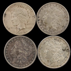Pick up some better date coins, with this selection of (4) Morgan and Peace silver dollars. Three of these antique treasures are considered key date coins, and silver dollars enjoy as much or more demand, as any other coin type. With silver on the rise the past few years, these coins have continued to escalate in value, and the future looks bright for the trend to continue.