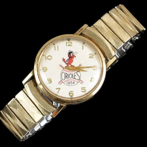Recall a favorable MLB franchise relocation, with this 1954 Baltimore Orioles team-issued wrist watch. After more than a half-century of floundering at the far western frontier of Major League play, the St. Louis Browns packed up and moved east as the rebranded Baltimore Orioles. The change started out dismally, with a 54-100 record in 1954, however by 1960, the Orioles became contenders. They went on to the franchise's first ever World Series championship in 1966, and enjoyed great success through the 1983 season.