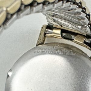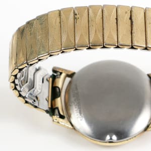 Hallmarked "I d" in a circle, this Orioles inaugural season watch is reported as a team-issued bonus, presented to the 1954 players, however no name has been engraved on the back. The face is adorned with the Orioles optimistic Bird mascot, perched on an Orioles lettered baseball, dated 1954. Etched into the back of the watch, is "Base Metal Bezel, Stainless Steel Back". The flex band is marked "Kreisler USA" on the back of nearly all links, while a link connected to the side of the watch is marked "1/20 - 10K GF Top, Stainless Bot.". Due to the absence of the knobs for winding and moving the hands, the watch face has shifted out of proper alignment, with the gold numeral 3 pointing at the 12 o'clock position. General light wear is noted, with little detraction to the pleasing appearance of this handsome timekeeper, which presents strong graphics on the face, and a gleaming gold-filled finish on the band.