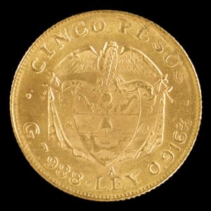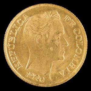 Liberator Simon Bolivar is honored on the obverse of this 1920 Colombia 5 Pesos gold coin. A few decades after U.S. independence was achieved, Bolivar led successful revolts against Spain in what are now the South American nations of Venezuela, Colombia, Ecuador, Peru and Bolivia, with the latter country named after him. Fronted by this driven statesman, this antique coin reports in appealing AU condition with nice luster. Stated on the reverse are the coin’s weight of 7.988 grams, and its gold purity content of 0.916-2/3 percent, along with an "A" mint mark. The actual gold content is .2355 of an ounce. Conquer your gold craving with the acquisition of this nicely preserved coin.