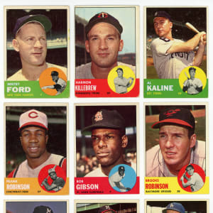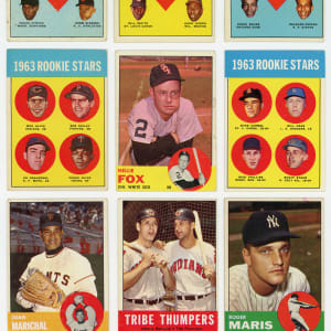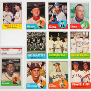 “Collector’s grade” 1963 Topps near set of 570/576 cards with three graded plus six variations. This eye-catching assembly has an approximate condition breakdown of 20% EX or better, 25% VG-EX, 30% VG and 25% GD or lesser with the challenging high series generally presenting on level with the more available numbers. Highlights include: #1 Aaron/Musial/F. Robinson LL (VG), #2 Mantle/Runnels LL (GD), #3 Aaron/Banks/Mays LL (VG-EX), #18 Buc Blasters/Clemente (VG), #25 Kaline (VG-EX), #115 Yastrzemski (EX), #120 Maris (FR, pen mark), #138 Mays/Musial (GD), #173 Mantle/Richardson/Tresh (VG), #210 Koufax (GD), #228 Oliva RC (GD), #242 Aaron/Banks (VG-EX), #247 Yankees Team (VG), #250 Musial (VG), #275 Mathews (EX), #320 Spahn (VG-EX), #345 B. Robinson (VG-EX), #360 Drysdale (EX), #380 Banks (colored), #390 Aaron (PSA VG 3), #400 F. Robinson (VG), #412 Drysdale/Koufax/Podres (VG-EX), #415 Gibson (EX, blank back), #440 Marichal (VG), #446 Ford (GD), #466 Freehan RC (PR, writing), #470 Tresh (VG), #473 Mets Team (PR), #500 Killebrew (GD), #525 Fox (GD), #540 Clemente (SGC EX 5), #544 Staub RC (EX), #550 Snider (VG-EX), #552 Tigers Team (FR) and #553 Stargell RC (SGC VG/EX+ 4.5). The following six variations are present: #29, #54 DeBuscchere RC (GD, 1962 Rookie Stars), 102, 431, 454 and 509 (average VG). Missing only #200 Mantle, #300 Mays, #340 Berra, #472 Brock, #490 McCovey and #537 Rose RC for completion.