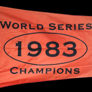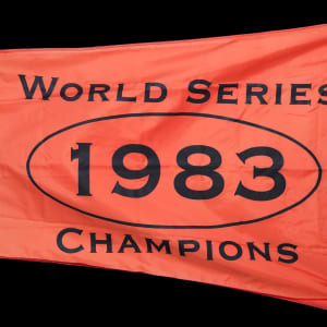 This 60x44 “birds' mouth” style banner proudly flew over Baltimore’s Memorial Stadium. Both sides of the banner proclaim, “World Series Champion” with “1983” in a large oval, a grand year for Eddie Murray and the Birds. The orange banner is in Good to Very Good condition with some fraying at the points from whipping in the breeze.
