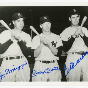 A young Mickey Mantle rubs elbows with a couple of already established all-time greats, in this triple-signed 8" x 10" photograph. Flanking the youthful Yankees up and comer, are Joe DiMaggio and Ted Williams. The only season Mantle and DiMaggio were both actively wearing pinstripes was 1951, and it's a good bet this shot was originally taken then. Each of the subjects has applied a rock solid ("10") strength signature over his uniform pants, and the crisp photo is perfectly suited for framed display.