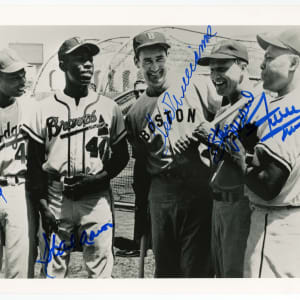 Serious collecting clout marks this multi-signed 1959 MLB All-Star Game photograph as a prime target for autograph collectors. All (5) of the pictured subjects have signed this crisp 8x10 photo over their corresponding images, with signature strength averaging ("9" to "10"). Featured signers are Hall of Famers Hank Aaron, Ted Williams, Stan Musial, and Willie Mays, along with Los Angeles Dodgers star Charlie Neal.