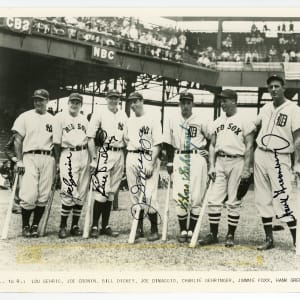 A mighty band of sluggers have joined in the signing of this 1937 MLB All-Star Game photograph. Our nation's capital had the honor of hosting the fifth edition of the Mid-Summer Classic, held at Griffith Stadium on 7/7/37. Boasting a loaded roster filled with tremendous hitters, the AL squad won the day, with an 8-3 triumph over their NL counterparts. Seven Hall of Famers are pictured in this classic on-field photograph, and (5) of them have signed across their uniforms. Unless noted, signature strength averages ("9" to "10") with from left to right: Joe Cronin, Bill Dickey, Joe DiMaggio, Charlie Gehringer ("7", enhanced), and Hank Greenberg. Adhesive residue across the foreground in front of the stars indicates a caption overlay has been removed. This condition, along with a black cropping mark at the upper-right corner, and a paper clip surface impression at bottom-center suggest this otherwise crisp and attractive photo was intended for publication.