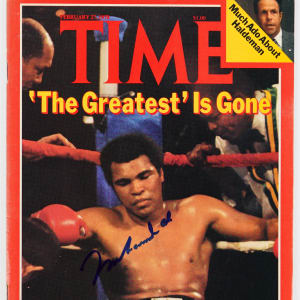 “‘The Greatest’ is Gone” declares this Time Magazine cover from February 27th, 1978, showing a dejected Muhammad Ali after losing his title to Leon Spinks. Perhaps the magazine was a bit premature because “The Greatest” came back to reclaim the championship, the only person to win it three times. This magazine is in Excellent condition with a blue sharpie (“8-9”) signature by the undisputed “Greatest,” Muhammad Ali.