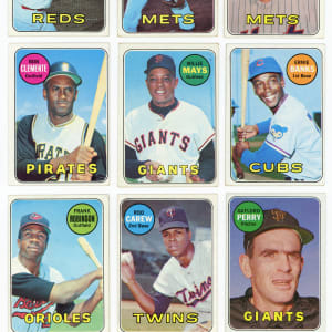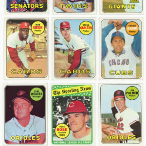 1969 Topps near: 658/664, 20% EX or better, 25% VG-EX, 35% VG, 20% GD or lesser, includes three PSA graded with #1 Yaz/Oliva LL (VG), #20 Banks (GD), #50 Clemente (VG-EX), #85 Brock (FR, reverse writing), #95 Bench (PSA EX 5), #120 Rose (VG), #130 Yastrzemski (GD), #190 Mays (VG), #200 Gibson (VG-EX), #250 F. Robinson (VG-EX), #255 Carlton (VG-EX), 345 (PSA NM-MT 8), #375 Killebrew (EX), #400 Drysdale (VG-EX), #410 Kaline (Authentic), #412 Mantle CL (EX), #424 Rose AS (VG), #430 Bench AS (VG-EX), 463 (PSA NM-MT 8), #480 Seaver (VG), #510 Carew (VG-EX), #516 Weaver RC (EX), #533 Ryan (VG), #573 Palmer (VG-EX), #597 Fingers RC (EX-MT), #630 Bonds RC (GD), #640 Jenkins (VG-EX), #650 T. Williams (VG); Missing: 6 cards with #100 Aaron, #260 R. Jackson RC, #500 Mantle, 504, #550 B. Robinson 657;
