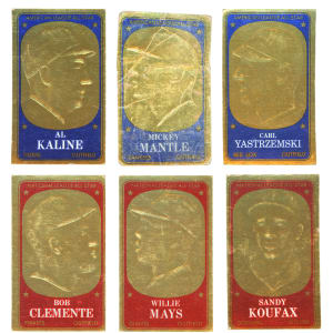 Supplement your 1965 Topps collection with the offered Embossed complete set of (72) cards. These gilt-based inserts generally present in the (VG to VG-EX) range with some better or lesser. Highlights include: #1 Yastrzemski (VG), #8 Koufax (VG), #11 Mantle (Authentic, reverse writing), #13 Kaline (VG-EX), #19 Clemente (VG), #22 F. Robinson (EX), #27 Mays (VG-EX), #58 Banks (EX) and #59 Aaron (EX).