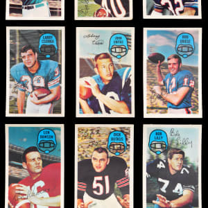 Merger-era 1970 Kellogg's Football complete set of (60) cards. This 3-D edition generally averages (NM) condition with many better and nearly 10% displaying surface cracking. A dupe of #34 Mackey (cracked) is also present. Highlights include: #6 Dawson (NM), #10 Butkus (NM-MT), #17 Griese (EX-MT), #41 Csonka (NM-MT), #48 Simpson RC (cracked), #51 Sayers (cracked), #54 Lilly (NM-MT), #55 Unitas (EX) and #59 Maynard (NM-MT).