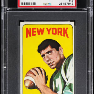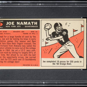 Graded EX-MT+ 6.5 by PSA. Never one to shy away from the limelight, "Broadway" Joe Namath is truly "larger than life" on the offered 1965 Topps Football #122 rookie shortprint. This "tall boy" displays three sharp corners, bright white edges and blistering surface colors. The burnt orange reverse which details Namath's SEC career is problem-free. A monumental cardboard classic that is worthy of any upper tier '65 collection. Ranks in the upper 14% of all similar Namath rookies validated by the third-party authenticator.