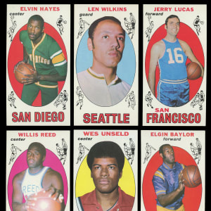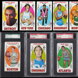 Superior 1969-1970 Topps Basketball near set of 95/99 cards with four graded. These razor-sharp court kings have an overall approximate condition breakdown of 15% NM-MT or better, 35% NM, 35% EX-MT and 15% EX or lesser with the lower end of the condition spectrum being primarily due to factory errant centering. Highlights include: #2 Goodrich RC (NM), #10 Thurmond RC (EX-MT), #14 McGlocklin RC (EX, miscut), #15 Hawkins RC (NM), #20 Havlicek RC (SGC NM+ 7.5), 28 (PSA NM-MT 8), #35 Baylor (EX-MT), #40 Cunningham RC (EX-MT), #44 Wilkens (NM), #45 Lucas RC (NM-MT), #50 Robertson (EX-MT), #55 Bing RC (NM), #56 Unseld RC (VG, reverse paper pulling), #60 Reed RC (EX-MT), #75 Hayes RC (EX-MT), 77 (PSA NM-MT 8), #78 Love RC (NM), #80 Monroe RC (EX-MT), #82 Nelson RC (EX), #85 DeBusschere RC (EX-MT), #90 West (SGC NM/MT 8) and #98 Frazier RC (EX-MT). Missing only #1 Chamberlain, #25 Alcindor RC, #43 Bradley RC and #99 CL for completion.