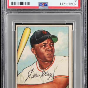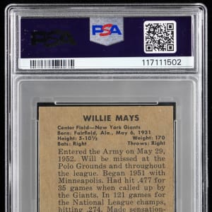 Graded EX-MT 6 by PSA. An intense Willie Mays surveys an incoming pitch on the offered 1952 Bowman #218 gum card. This second-year high number of the New York Giants Hall of Famer displays only evenly touched corners, crisp factory edges and brilliant surface colors. The reverse, which details Mays' burgeoning United States Army career, is problem-free.