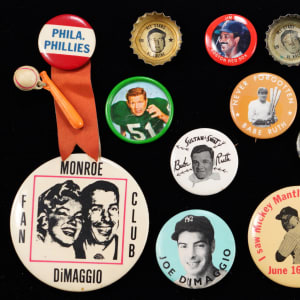 This group from the 1910s to the 1980s includes Coca-Cola bottle caps, P2 pins, stadium pins and pins of all types and sizes. They are 90% baseball with 10% other sports. It includes (45) pins and (43) bottle caps (1967). The pins include Hall of Famers like Babe Ruth (3), Joe DiMaggio (2), Ted Williams (3), Mickey Mantle, Reggie Jackson, Thurman Munson, and John McGraw. The 1967 Coca-Cola bottle caps include Banks, Kaline, Marichal, Rose, Bunning, Mazeroski, and Allen. The bottle caps show the usual exterior rust and wear while the inside images are clean. The overall condition of this group averages Good to Excellent.