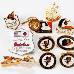 A celebration of the Baltimore Orioles greatest triumphs is at hand, with this collection of (9) World Series press pins, cuff links, and tie clips. This exceptional collection forms a complete run of the O's championships, with examples from each of the six seasons they won AL pennants, including all three World Series championship years. Joining these treasures, is a rare souvenir from the 1971 Tour of Japan. This appealing collection of winning season keepsakes is populated with nicely preserved examples, ranging (EX to NM+).