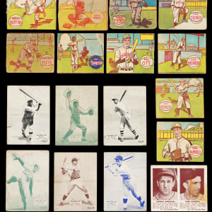 1934-1936 Batter-Up: (19 cards, average FR with 21% punched, reverse stamps or tape, includes one high number) with #2, #5 Hubbell (FR), #6 Terry (PR), 7, #10 R. Ferrell (GD), 12, #14 Traynor (GD), 15, #17 L. Waner (GD), 19, 20, 26, 29, 39, 40, 41 (punched), 63, 74, #134 Harder (punched);