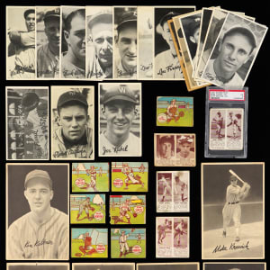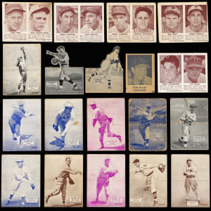 1943 R302-1 M.P. & Co.: (16 cards, average FR to GD) with Bonham, Boudreau (VG-EX), Cronin (FR), Danning, Feller (PR), Hack, Henrich, Hubbell (FR, paper loss), Kozar, Medwick (GD), Ott (VG), Reese (PR, writing), Reiser, Ruffing (GD), Vander Meer, T. Williams (Authentic, writing);