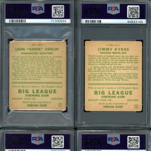 Each graded by PSA. Three Hall of Famers and the first Baltimore Orioles manager comprise the offered grand slam of 1933 Goudey singles. Includes: 1.) #6 Dykes (PSA GOOD+ 2.5, Age is 36 in Bio); 2.) #110 Goslin (PSA VG 3); 3.) #138 Pennock (PSA GOOD 2) and 4.) #222 Gehringer (PSA FAIR 1.5).