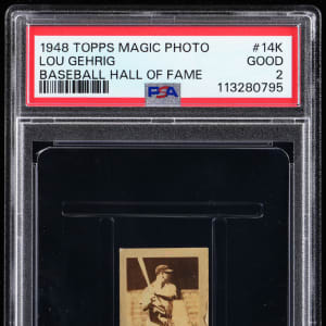 Graded GOOD 2 by PSA. Issued only seven years after his passing, the legendary Lou Gehrig swings again on the offered 1948 Topps Magic Photos #14K example. Despite a microscopic hint of reverse residue, the front of this glossy black-and-white tiny treasure is uncracked with crystal clear registration. Less than 100 total copies of this New York Yankees Hall of Famer have been validated in any condition!