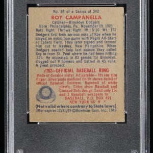 Graded VG-EX 4 by PSA. Foundational 1949 Bowman #84 Roy Campanella rookie card. This Brooklyn Dodgers Hall of Fame great displays well-constructed corners, crisp factory edges and bright surface accents. The reverse which details Campy's biography is clean.