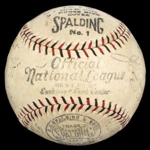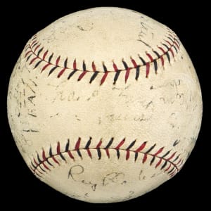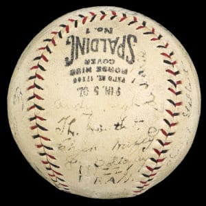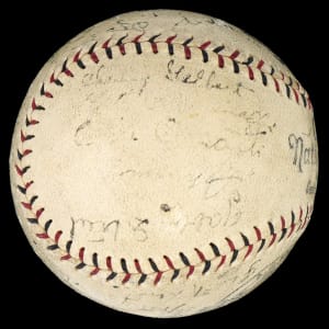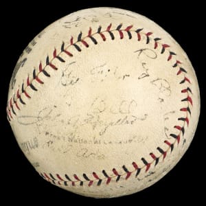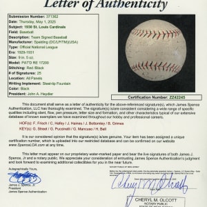 The colorful squad famously known as the "Gashouse Gang" drops in, with this 1930 St. Louis Cardinals team-signed baseball. It would have been surprising if this team hadn't won the National League pennant. Of the 13 position players with 100+ at-bats, 12 hit over .300, and 5 of their starting pitchers racked up double-digit win totals. This ONL/Heydler baseball with readily discernible factory labeling, is a fine collectible in its own right. The addition of (25) period signed autographs by the NL champs, lights up the value radar in a big way. Though the signatures range ("2" to "4"), most are recognizable, including (5) Hall of Famers, and plenty of stars.