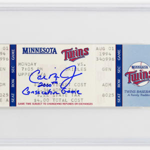 Mark a "Streak" milestone for Cal Ripken Jr., with this signed and inscribed full ticket. Dated 8/1/94 for a Baltimore Orioles visit to the Minesota Twins, this nicely preserved ticket is from the 2,000th consecutive game played of Ripken's Hall of Fame career. Ripken has signed boldly on the front, with the pertinent inscription "2000th Consecutive Game". PSA has encapsulated this significant memento with and grade of ("10") for the sharp blue felt-tip pen signature, and a grade of (NM-MT 8) for the crisp, clean ticket.