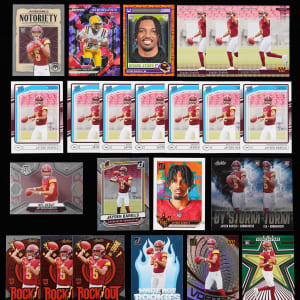 Jayden Daniels, 2024 NFL Offensive Rookie of the Year, showcases his dazzling talent with these (50) rookies cards featuring a variety of inserts. The Washington Commanders quarterback is highlighted by the following: 2024 Donruss: (16) #389 RC, #1 Gridiron Kings, #8 White Hot Rookies, #37 Rookies, Vortex; 2024 Absolute: (10) #102 RC, (3) By Storm, (4) Introductions (two different poses); (3) Rock Out; 2024 Panini Mosaics: #272 RC, #19 Notoriety and 2024 Prizm Draft Picks: New Recruits Red.