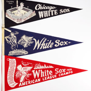 (2) blue on white Chicago White Sox pennants featuring hitter in Comiskey Park (one of them cartoon style).