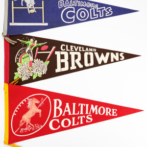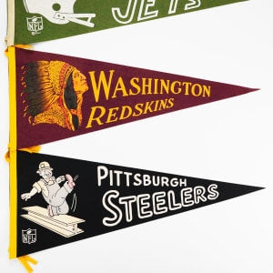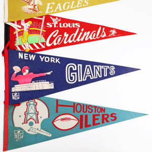 Add the visceral appeal of waving pennants to a marching band and you have the feel of fall football of the 50s and 60s. These (10) pennants average VG-EX to EX condition with very few pinholes. They include Houston Oilers, Baltimore Colts (2), Pittsburgh Steelers, Cleveland Browns, St. Louis Cardinals, Philadelphia Eagles, Washington Redskins, New York Giant and New York Jets.