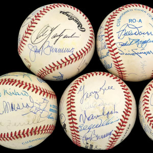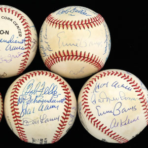These (5) baseballs are adorned with the signatures of (76) Hall of Fame greats. The balls average creamy white or better, and the signatures average (“8-9”) with a few lesser.
