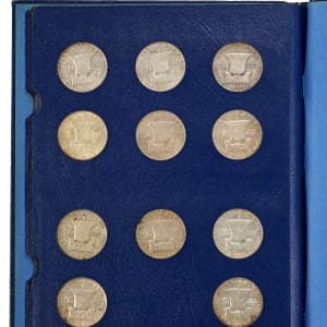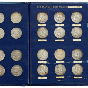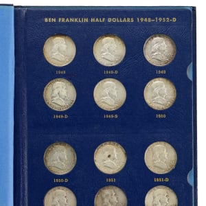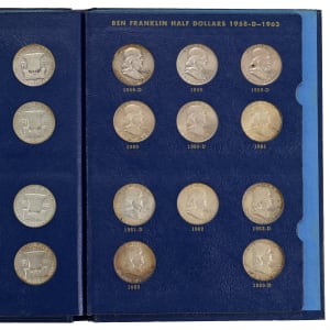 Founding Father Benjamin Franklin is honored, with this 1948-1963 Franklin half dollar complete set (35). While George Washington performed the military miracles in holding the Continental Army together to defeat the British, the wizened Franklin worked his magic domestically and abroad, as a very persuasive statesman and diplomat, to secure American independence. Housed in a Whitman album, this set of silver coins ranges (FN to AU) in condition.