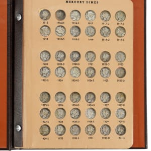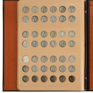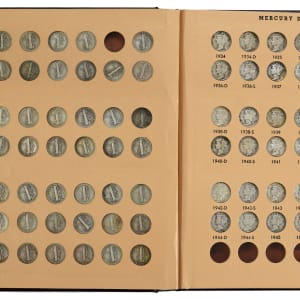 Absent only an example of the elusive 1916-D, this 1916-1945 Mercury dime near-complete set totals (76/77) possible dates and mint marks. Comfortably at home in a premium Dansco album, this near-set of 90% silver dimes ranges (65% FN to XF, 35% GD to VG). The 1921 and 1921-D key dates are both (GD). Coins worth noting in better grades of FN to VF are: 1916-S, 1918-S, 1919-D, 1919-S, 1924-D, 1925-D, 1928-S, 1930-S, 1931-D, 1935-S, 1936-S, 1937-S.