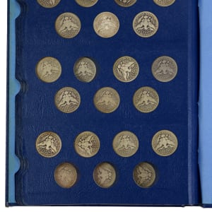 Skip the vast majority of the hunting and gathering process normally required to attain a full set with the acquisition of this 1892-1916 Barber quarter near-complete set of 71/74. Only the big three keys are absent, which are the scarce 1896-S and 1913-S dates, along with the extremely tough 1901-S. All other possible dates/mint marks for this series are present and accounted for. Housed in a Whitman album, this near-set of antique silver quarters ranges 90% GD to 10% AG. Semi-key dates average GD, unless noted: 1892--S (AG), 1893-S, 1895-O, 1895-S, 1896-O, 1897-O, 1897-S, 1899-S, 1901-O, 1904-O, 1905-O, 1907-S, 1908-S (AG), 1909-O, 1911-D, 1913, 1915-S.