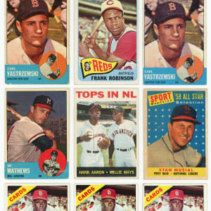 1963 Topps: (63 cards, average GD) with #18 Buc Blasters/Clemente (GD), (2) #115 Yastrzemski (one GD, one trimmed), #228 Oliva RC (FR), #275 Mathews (GD), #340 Berra (GD), #440 Marichal (GD);