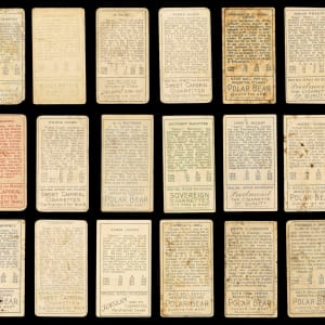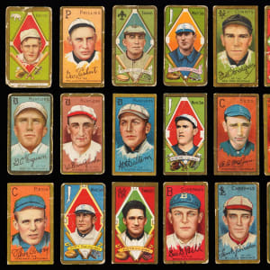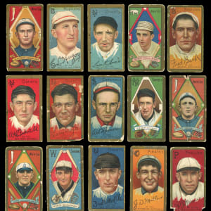 Jump into the 1911 T205 Gold Border fray with these (43) different tobacco cards. Although each card is low-grade with none surpassing (FR) condition, these turn-of-the-century big leaguers are still recognizable. Nearly 55% displays paper loss/residue, pin holes, tape, trimming and/or writing. Unless noted, each artifact features a common advertising back. Subjects include: Ames, Austin, Barry, Beck, Bell, Bridwell, Corridon, Dooin, Doolan, Downey, Doyle, Duffy (PR), Ferguson, Goode, Harmon (Both Ears Show), Herzog, Knight, Kroh, Lang (Sovereign), B. Lord, H. Lord, Magee SP (PR, pin hole), Mattern, McBride SP (PR, reverse residue), McIntire, McLean, Merkle, Miller, P. Moran (No Stay Line), Mullin, Oakes, Oldring, Olmstead, Parent, Paskert (Sovereign), Payne (Sovereign), Pelty SP (PR), Quinn, Scott, Snodgrass, Tannehill, Willett and Wolter.