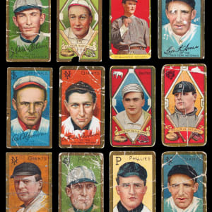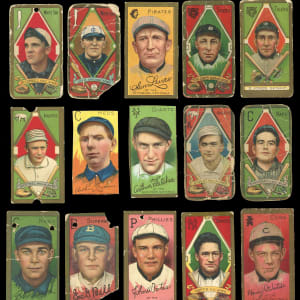 “OBC” loyalists will enjoy the offered 1911 T205 Gold Border collection of (43) cards featuring a pair of Hall of Famers. These 114-year-old cards are low-grade with each having sustained acute wear including severe creasing and brittle foundations along with the vast majority displaying paper loss/residue, pin/punch holes, trimming and/or writing. Unless noted, each relic is flanked by a common advertising back. Subjects include: (2) Ames, Austin, Bates, Bell, Bescher, Birmingham, Clarke (PR), Devlin, (2) Dygert, Fletcher, Fromme, Harmon (Boths Ears Show), Hartsel, Hauser, Jacklitsch, D. Jones, T. Jones, Kleinow SP (pin holes), Leever, H. Lord, McAllister (trimmed, Newark), McConnell, McGraw (PR), McIntire, P. Moran (No Stray Line), (2) Moriarity (one Sovereign), Mullin, Needham (significant front paper loss), O’Leary, (2) Olmstead (one Sovereign), Phillippe (significant front paper loss), Rowan SP, Schaefer, Schlei (skinned), Schulte, Stone, Street, Wilson and Wiltse (Both Ears Show).