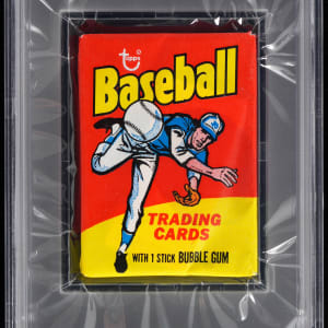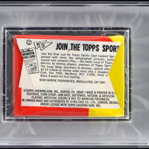 Graded MINT 9 by PSA. "To open or not to open?" is the tantalizing question asked with the offered 1975 Topps Mini unopened wax pack. This high-grade 50-year-old survivor is perfectly centered with crisp factory folds and bold advertising graphics. Pull high-grade singles of Aaron, Aaron HL, Bench, Brett RC, Carter RC, R. Jackson, Rice RC, Rose, Ryan, Schmidt, Winfield and Yount RC. Ranks in the upper 6.7% of all similar packs validated by the grading company.