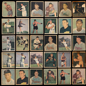 Singles: (39 cards, average VG to EX with 18% displaying paper loss/residue, tape and/or writing) with #1-3 Rizzuto (PR, reverse residue), #1-7 Mize (EX), #2-17 Button (EX), #3-1 Kiner (GD), #3-18 J. Owens (GD)