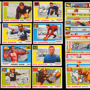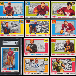Never graduate from the offered 1955 Topps All-American Football starter set of (48/100) different including an SGC graded legend. These crisp horizontal collegians generally present in the (EX to EX-MT) range with some better or lesser. Keys include: #6 Kinnick RC (EX), #24 Strong (VG-EX), #37 Thorpe (SGC EX/NM 6), #52 Lujack (EX-MT), #59 Blanchard RC (EX-MT), #64 Friedman RC (EX) and #85 Luckman (EX-MT).
