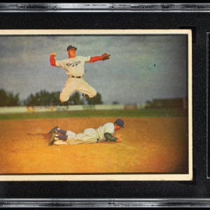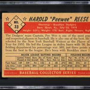 Graded VG 3 by SGC. Harold (Pee Wee) Reese rises above the competition on the offered 1953 Bowman Color #33 gum card. This spectacular pose which is highly regarded throughout the hobby survives in pleasing mid-grade condition. Brooklyn Dodgers Hall of Famer.