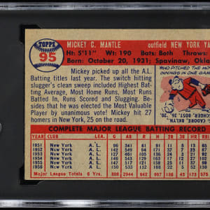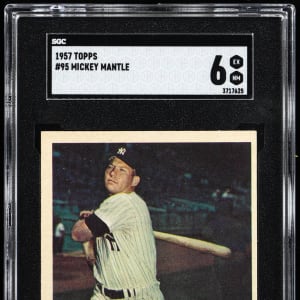 Graded EX/NM 6 by SGC. Powerhouse 1957 Topps #95 Mickey Mantle, showing the New York Yankees Hall of Fame slugger following through on his devastating swing. Aside from factory errant centering common to the issue, this crisp "Mick" otherwise showcases strong corners, creamy edges and "picture perfect" surface registration. Ranks in the upper 9% of all similar copies evaluated by the authenticator.