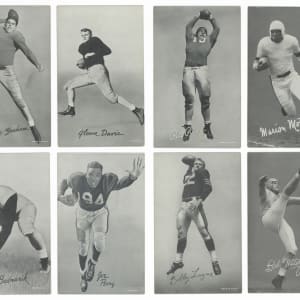 Featured is a 1948-1952 Football Exhibits starter set of (24/59) cards. This acclaimed black-and-white series generally presents in the (VG to EX) range with some better or lesser. Keys include: Bednarik SP (VG-EX), G. Davis SP (VG), Dudley (VG-EX), Graham (VG-EX), Layne (VG-EX), Lujack (VG-EX), Motley (EX), Perry SP (EX), Pihos (VG-EX) and Waterfield (VG).