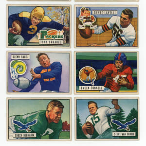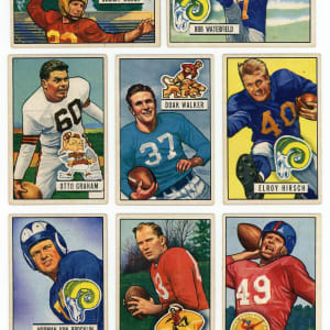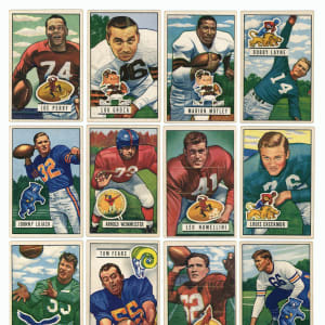 Essential 1951 Bowman Football near set of (140/144) cards. These gridiron stars have an overall approximate condition breakdown of 25% (EX or better), 35% (VG-EX) and 40% (VG or lesser). Keys include: #1 Humble RC (GD), #2 Graham (VG), #4 Van Brocklin RC (GD), #6 Fears (VG), #10 Van Buren (VG), #12 Bednarik (VG-EX), #13 Turner (VG-EX), #15 Lujack (VG-EX), #20 Landry RC (VG), #21 Weinmeister RC (VG-EX), #25 D. Walker (VG-EX), #32 Tittle (VG-EX), #34 Baugh (VG-EX), #40 Waterfield (VG), #42 G. Davis (EX), #46 Pihos (EX), #56 Conerly (VG-EX), #62 Creekmur RC (VG-EX), #73 Lavelli (VG-EX), #75 Groza (VG-EX), #76 Hirsch (EX), #90 Canadeo (VG-EX), #91 Tunnell RC (VG), #96 Stautner (VG), #102 Layne (VG-EX), #105 Perry (VG-EX), #109 Motley (VG-EX), #137 Trippi (VG), #140 Nomellini (VG) and #144 Dudley (VG). Missing only #45, 92, 99 and 123 for completion.