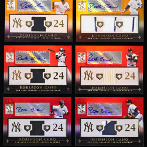 Incredible 2010 Topps Tribute Robinson Cano certified autograph triple/single relic collection of (24/25) cards. This "Nolo" collection features (4) 5-card signed single relic rainbows of poses #1, 2, 3 and 4 (including #1/1) and a (4/5) signed triple relic near rainbow for pose #5 (missing #1/1).