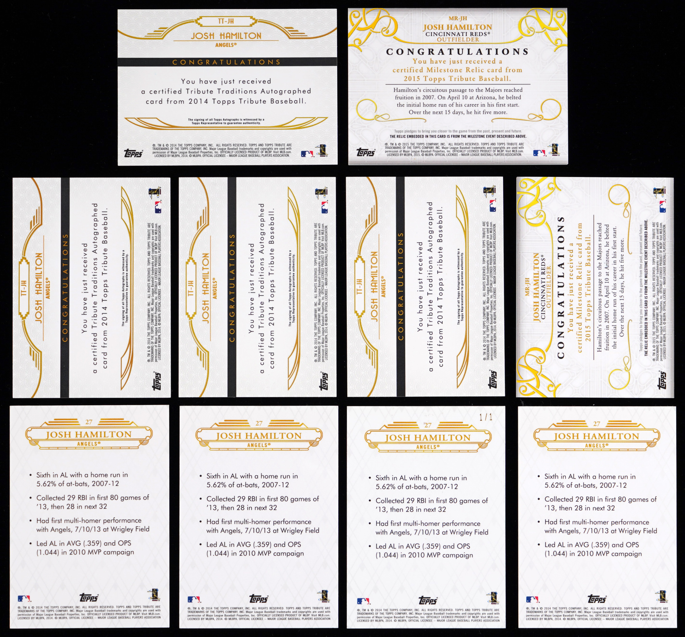 Presented is a 2014 and 2015 Topps Tribute Josh Hamilton collection of (10) modern inserts. Includes: 2014 Topps Tribute Traditions Certified Autos: (4 cards) with #1/1 Onyx with biblical inscription, #/5 red, #/15 gold, #/25 green; 2014 Topps Tribute Milestone Relics: (2) #/10 (both MLB holos) and 2014 Topps Tribute #27 Base: (4 cards) with #1/1 printing plate, #1/1 purple, #/5 red and #/25 gold.